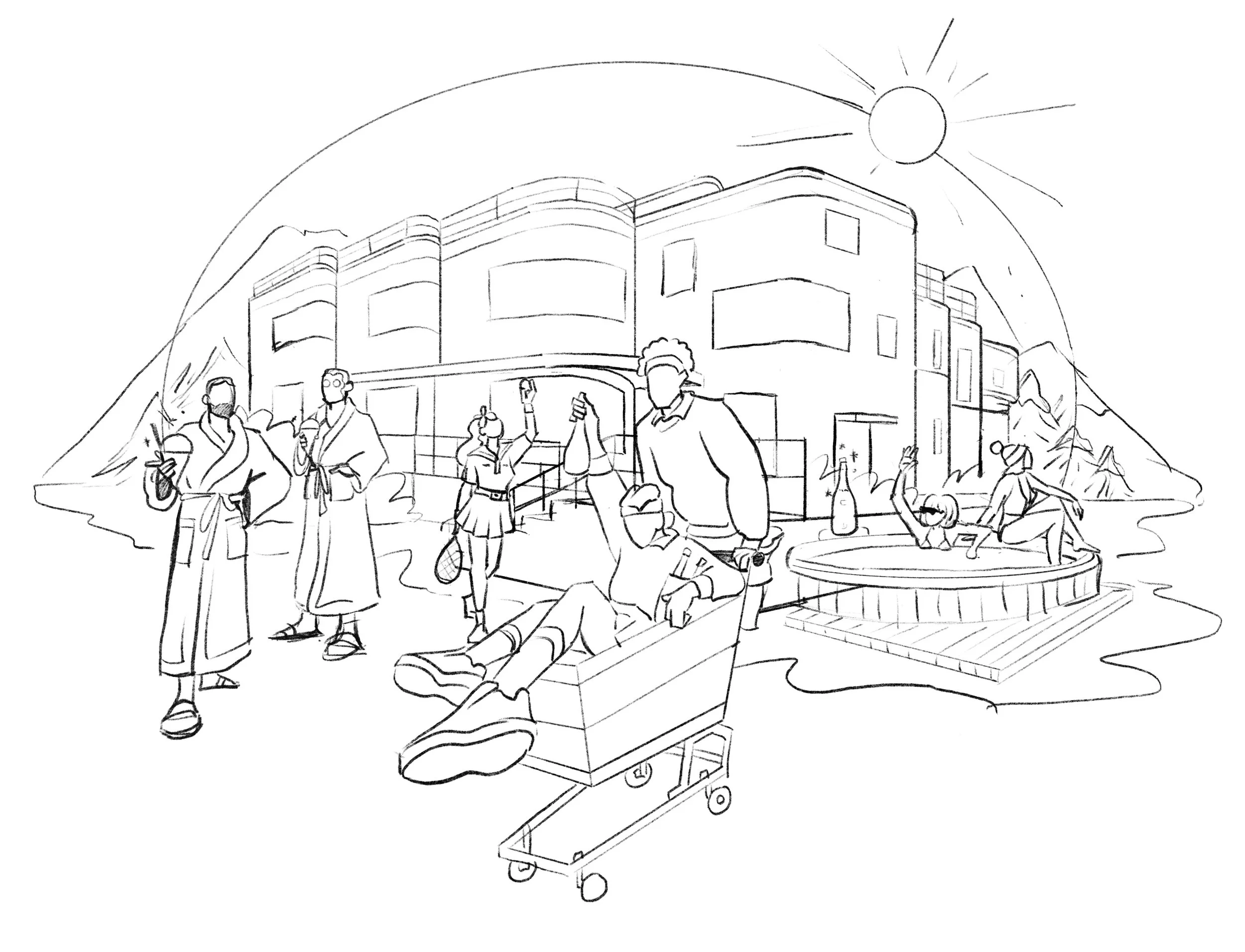 Client: EvianIllustrating a lifestyle concept for a city spa location for Evian Scamping, storyboarding, illustration
