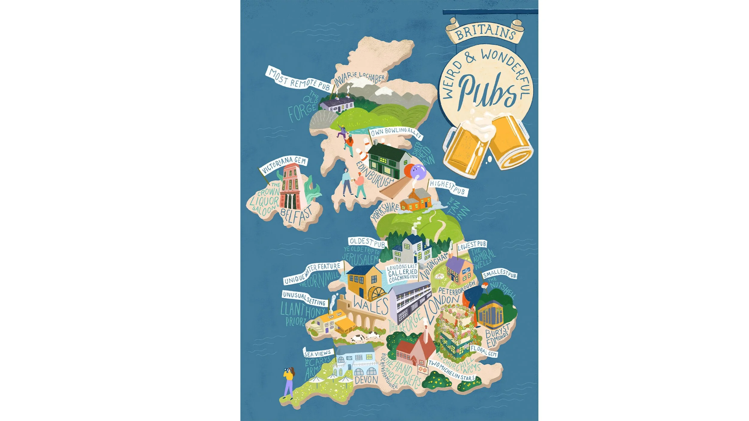 Client: Visit BritainA map for Visit Britain highlighting the side of the UK less seen by a tourist’s camera, featuring weird and wonderful pubs.Design concept, illustration.