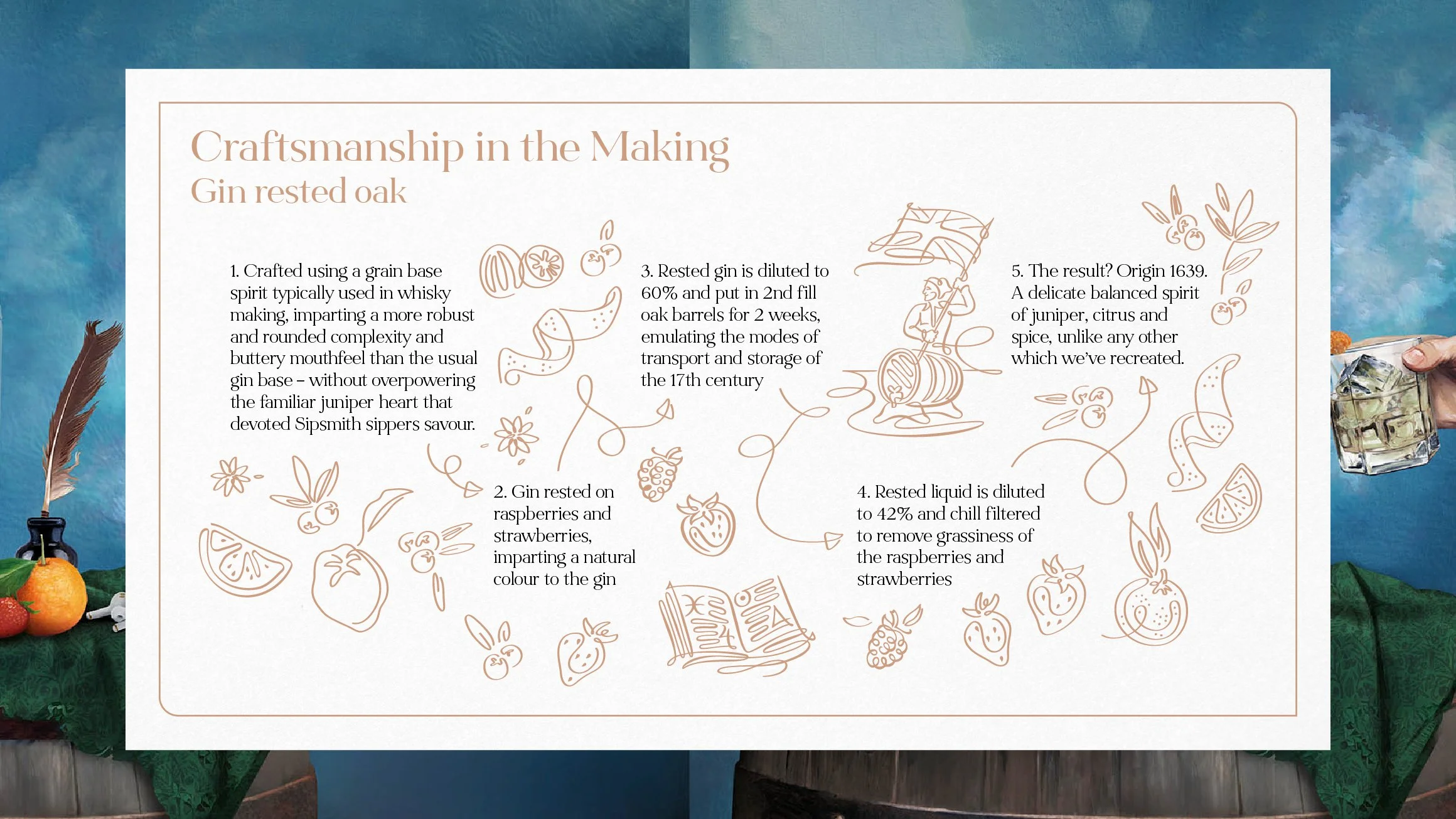 A presentation box, infographic and pattern development for the new Origin 1693 Gin, featuring bespoke illustrations and a history of gin.